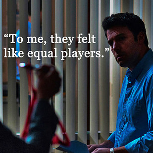 GF: I didn't ever consider voice-over for Nick, because I felt like it could very easily turn into a book on tape. I beefed up [Nick's twin sister, played by Carrie Coon] Go's role a little bit, to give her some of those moments with him. But I also really wanted him to take on the role of us projecting our emotions onto him. I wanted him to feel more of a cipher, that Amy was hypnotically working her magic.