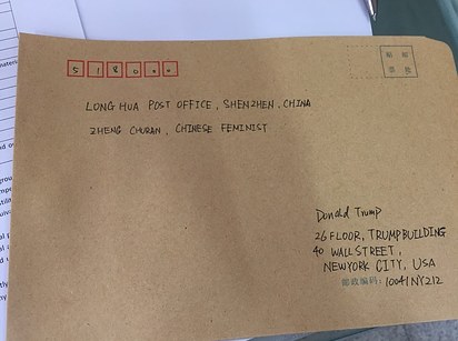 Zheng sent the mail from a small post office in Shenzhen to the Trump Building on Wall Street, whose address is "too famous not to know." She also tagged @realDonaldTrump in a tweet, hoping to get a response from the President-elect and to raise public awareness of the issue of sexual discrimination.
