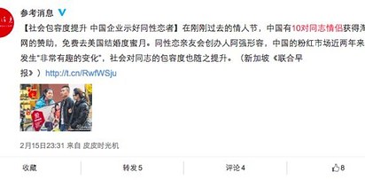 But least two members of China's state-run media, Reference News and Beijing's Mirror Evening News, posted about the wedding on Weibo. "Love and to be loved are basic rights of everybody, [we] hope [society] could be more tolerant," the latter wrote.