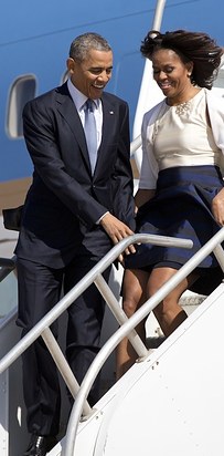 While exiting the plane, because it was super windy, the first lady's dress kept flapping up.