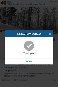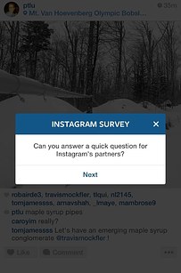 Yesterday afternoon, while thumbing through endless cascades of pink Valentine's hearts, kiss-y selfies, and blizzard prep photos, a number of Instagram users received a pop-up surprise in the form of an unfamiliar advertiser survey.