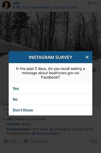 One survey, which was delivered to a BuzzFeed News employee, asked if the user could recall seeing any sort of message from healthcare.gov on Facebook, the social network which owns Instagram.