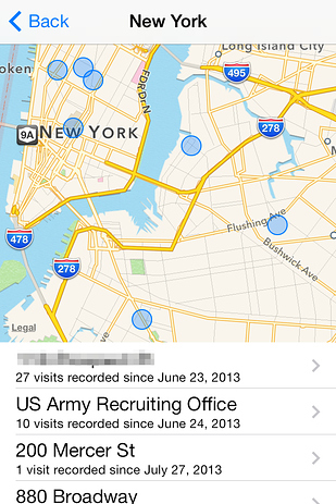 The information isn't always accurate, nor is it comprehensive — for instance, I've never been to a U.S. Army recruiting office, it just happens to be near my office — but for some locations, like my apartment, the records are accurate down to the hours and minutes I've spent there.