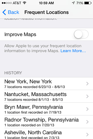 I've been using iOS 7 since mid-June with enabled location services (the data is only collected if you've enabled the location feature) and decided to check my own log, which I was able to do easily with six swipes of a finger (Settings → Privacy → Location Services → System Services → Frequent Locations). What I found was a rather spotty but still somewhat astounding record of my movements over the past six weeks.