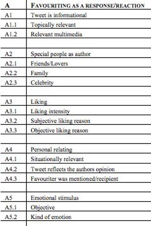 Thanks to a study published by the Association for the Advancement of Artificial Intelligence, this year we now have what amounts to an official taxonomy of faving behaviors. Conducted by Florian Meier and David Elsweiler from the University of Regensburg, Germany and Max L. Wilson from the University of Nottingham after extensive surveys with 606 Twitter users (many long-term users), the study sought to classify the myriad of individual reasons for favoriting a tweet in order to "enhance our understanding of what people want to do with Twitter."