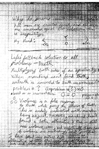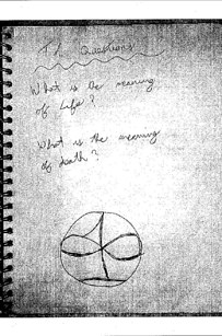 The following pages, titled "Insights into the Mind of Madness," detailed philosophical questions of life, death, and human value. Together with what he told psychiatrists, the philosophy shows psychotic delusion, defense attorney Daniel King said.