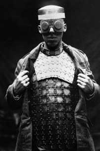 Left: An unidentified soldier shows off the latest advances in body armor, circa 1915. Right: A German cavalryman wearing a gas mask and carrying a long spear highlights the collision of two different ages of war.