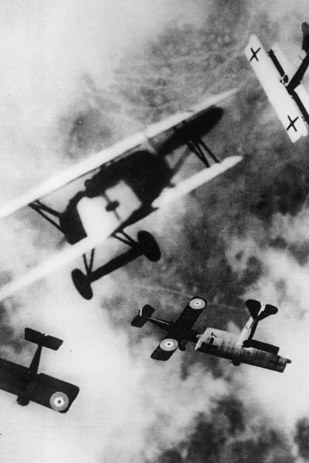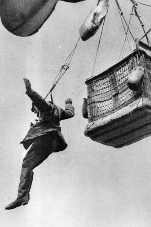 Left: British SE-5s are locked in aerial combat with German Fokker D7s, circa 1915. Right: A German soldier parachutes from an observation balloon after it had been destroyed by enemy action in 1918.