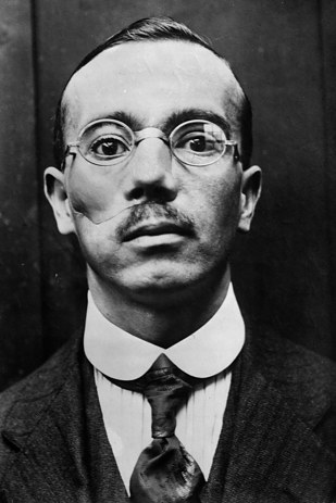 A wounded soldier is photographed with and without a facial prosthesis in 1914.
