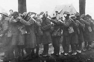 French troops with bayonets and primitive gas masks prepare for combat in the second Battle of Ypres in 1915.