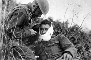 Left: British soldiers blinded by chlorine gas are led through a military encampment in 1918. Right: A wounded American soldier receives first aid at Varennes-en-Argonne in September 1918.