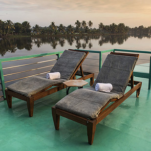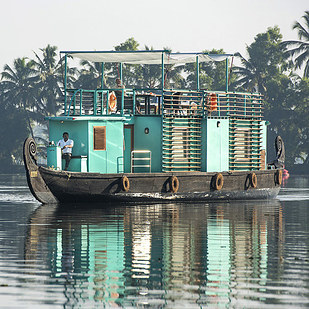 The Houseboat Discovery sails as part of the Malabar Escapes boutique hotel chain in the backwater channel system of Kerala, India. Within this traditional rice barge are all the amenities of a standard hotel room, as well as a boat captain, driver, service boy, and chef.