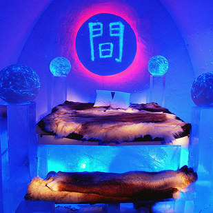 The Icehotel is the world's first and largest hotel built entirely out of snow and ice. The hotel is situated in a small village in Northern Sweden with 1,100 residents and 1,000 dogs. It is constructed from 1,000 tons of Torne River ice and 30,000 tons of "snice," a mixture of snow and ice that strengthens the structure.