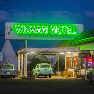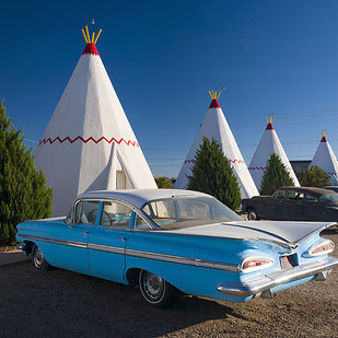 The Wigwam Motel in Holbrook, Arizona, has rooms in the shape of teepees and old classic cars resting in the parking lot, evoking nostalgia for a time when Route 66 was the main passage in the area.