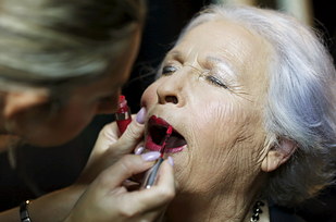 Rivka Kushnir, 85, a Holocaust survivor, has her make-up done.