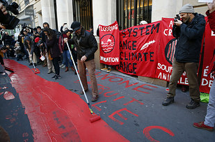 Activists of "Via Campesina" also gathered in front of the headquarters of French multinational food company Danone with red paint, while activists staged a protest outside the Louvre pyramid.