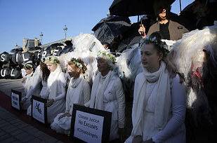 Dressed as angels and sporting umbrellas with the message "fossil free culture," the group called on the world famous museum to cancel contracts with French oil giant Total and Italian oil company Eni.