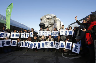 Demonstrators have used the structure to affix messages demanding action on a number of environmental issues, including parity among rich and poor nations.