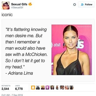 "Adriana loves a McChicken from time to time when she's not on a catwalk, but she has never referenced the delicious sandwich in this way," she said.