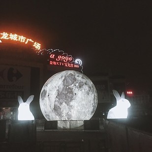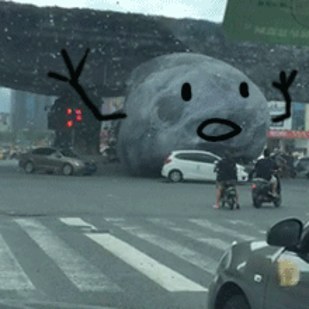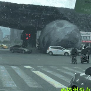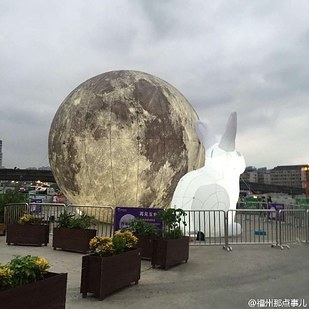 "Drunk! The moon installation in front of the KFC at Fuzhou's Powerlong Shopping Mall has been blown away by the typhoon! Powerlong had set up a giant moon and two rabbit balloons in front of its entrance to welcome the Mid-Autumn Moon Festival but hadn't fixed it properly to the ground so the typhoon blew it away onto the road, and it just wouldn't stop!"