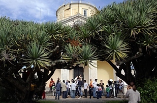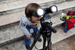 People gather around telescopes trying to catch a glimpse of a solar eclipse Sunday, Nov. 3 2013, outside Lisbon's Astronomical Observatory. Clouds moving over the city allowed only brief views of the eclipse which in southern Europe was partial.