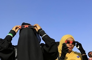 Veiled women observe a solar eclipse during an event organized by the Sudanese Society for Astronomy and Space Science on the banks of the Nile river in Khartoum, Sudan.