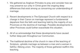 He referred to a leaked version of Welby’s address to the communion that “talks about the exemptions given to the Church of England over equal marriage as being a sign of our strength. Actually it’s a sign of our weakness – parliament turned round and said, ‘Stand in the corner, we’re doing it anyway.’ It says more about Welby’s mindset that he looks at defeat and defeats in our influence in the world and sees that as a victory.”