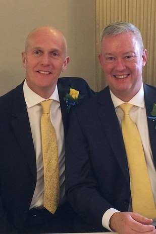 Jeremy Pemberton and Laurence Cunnington pose in their wedding attire