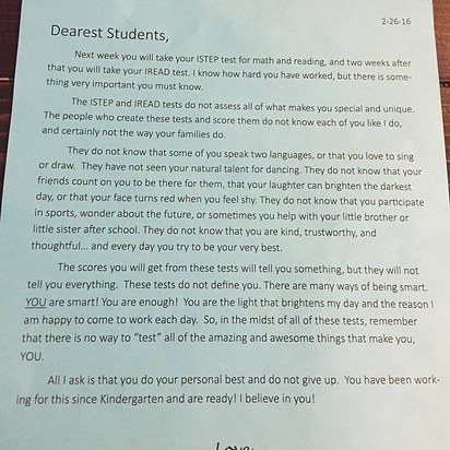 The letter from his teacher, who is choosing to remain anonymous, encouraged the students not to stress out over the test because it doesn't assess "all of what makes you special and unique." The teacher said in part: