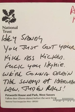 The anti-Semitic note was shared on social media by his wife, Cynthia Levinson, who wrote, "This has never happened before in my lifetime."