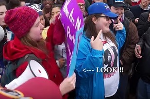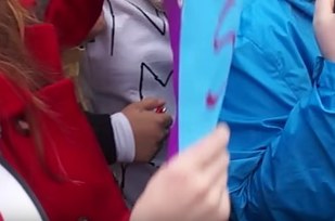 In the video, the girl — wearing a blue Trump hat and a Trump T-shirt — is seen posing for a photo in front of anti-Trump protesters.