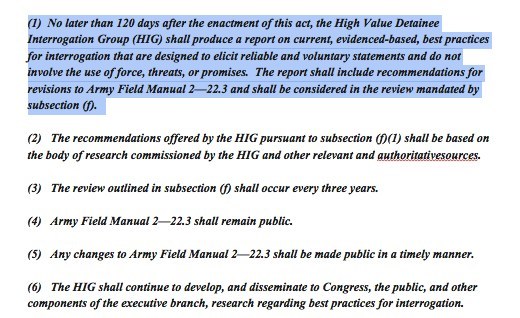 “Early on there was an idea that future revisions [of the Field Manual] would be informed by research and the HIG,” said one person with knowledge of the situation, who was not authorized to speak on the matter. House lawmakers, though, balked at the HIG’s involvement, and the decision was made to sacrifice the language in order to get the larger anti-torture statute through, they said.