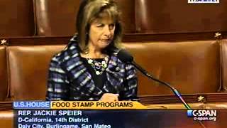 "In my district, California 14, we have about 4,000 families who are on food stamps, but some of my colleagues have thousands and thousands more," Rep. Speier said. "Yet, they somehow feel like crusaders, like heroes when they vote to cut food stamps. Some of these same members travel to foreign countries under the guise of official business. They dine at lavish restaurants, eating steak, vodka and even caviar. They receive money to do this. That's right, they don't pay out of pocket for these meals."