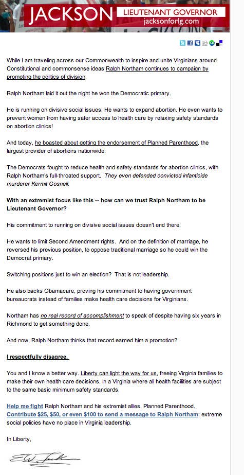 Jackson ends his fundraising email by saying: "Help me fight Ralph Northam and his extremist allies, Planned Parenthood. Contribute $25, $50, or even $100 to send a message to Ralph Northam: extreme social policies have no place in Virginia leadership."