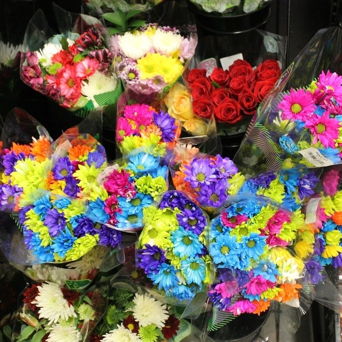 And velcro shoes next to unnaturally colored flowers.