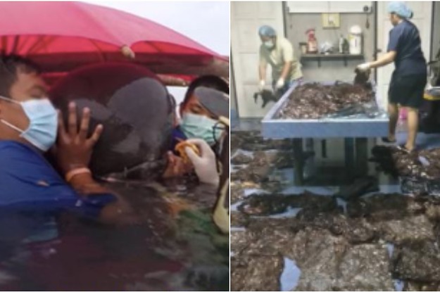 The team discovered the animal barely alive on Monday, struggling to stay afloat and breathe in a canal near the Malaysian border, Thailand's department of marine and coastal resources said on Facebook. They deployed red umbrellas to shade him from the relentless sun and buoys to keep him afloat as veterinarians tried to help him eat and gave him medicine, staying in the water with him for 24 hours to try to keep him alive, officials said.