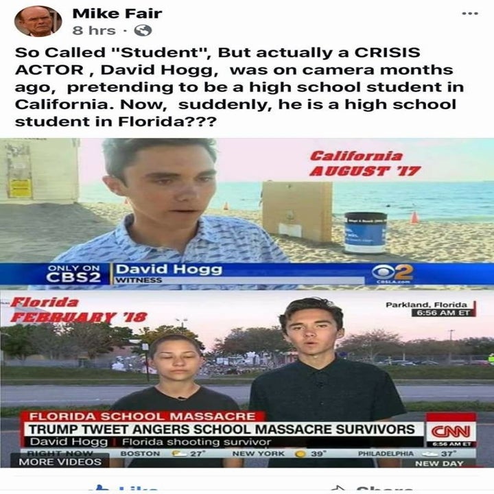 As of Tuesday night, 108,135 people were talking about "crisis actors" on Facebook. One video had been watched more than 41,000 times and shared by about 2,300 users. Before it was removed, another Facebook post calling Stoneman Douglas senior David Hogg an actor was shared more than 110,000 times. Yet another clip posted on Twitter got more than 6,000 retweets.