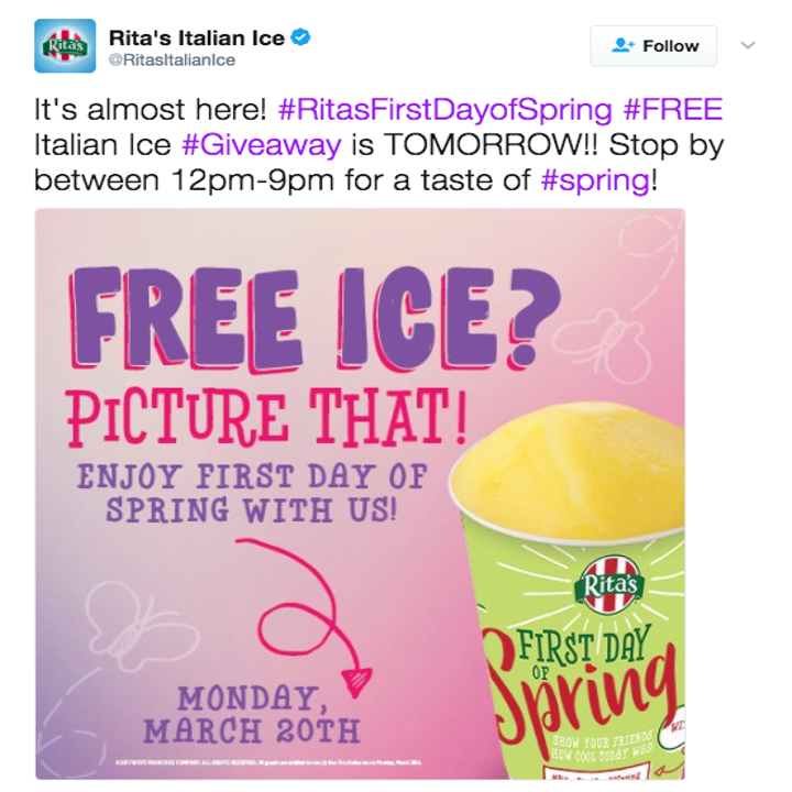 For the last 25 years, Rita’s has been giving away free frozen desserts to celebrate that winter is finally over. That is, if you're lucky enough to live in one of the 32 states that are home to the Italian ice and frozen custard shop.