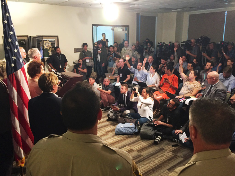 LVMPD Sheriff Joseph Lombardo updating the press on the number of people injured in the Las Vegas shooting
