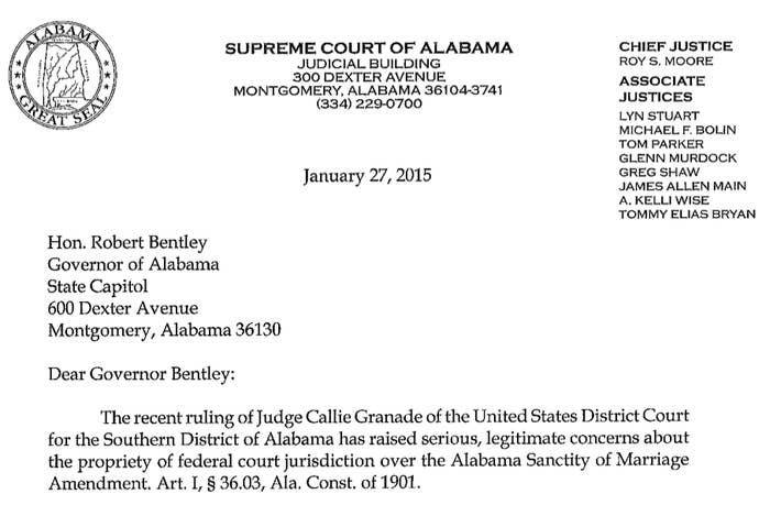 Moore's letter came on the same day the federal judge in question, U.S. District Court Judge Callie Granade, issued a second ruling on the issue. Although the first case involved a plaintiff same-sex couple who had married in California and sought only to have their marriage recognized in Alabama — leading to questions about whether Granade's order could cover marriage licenses — Tuesday's ruling involved a same-sex couple who "seek to marry in Alabama."