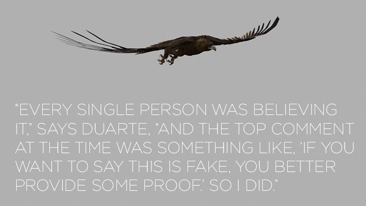 But others were less skeptical than Duarte. "Every single person was believing it, and the top comment at the time was something like, 'If you want to say this is fake, you better provide some proof.' So I did."