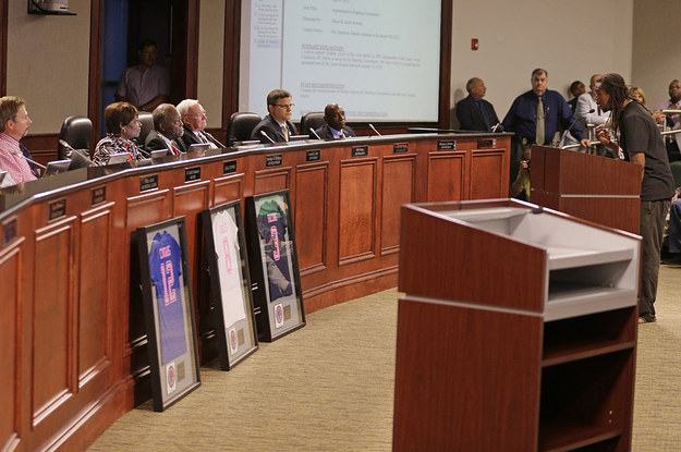 NORTH CHARLESTON, South Carolina — Before a local protest leader took the floor at Thursday night's city council meeting in North Charleston, a packed audience of white and black residents, uniformed and civilians found themselves coming together in a standing ovation for a common cause: the high school girls of North Charleston's powder puff football league.