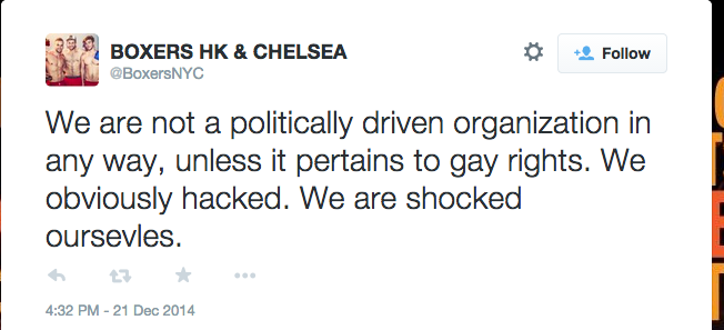 A New York City chain of gay sports bars has apologized for a series of tweets sent from its account Saturday night in the wake of the shooting deaths of two NYPD officers, telling BuzzFeed News the account "was obviously hacked."