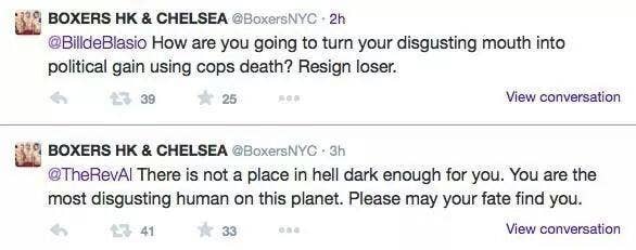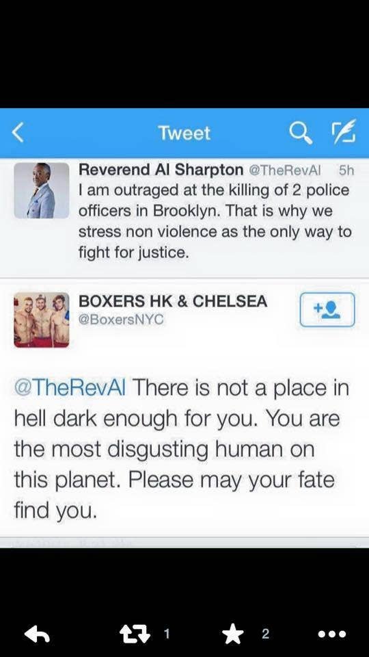 "There is not a place in hell dark enough for you. You are the most disgusting person on the planet. Please may your fate find you," an account belonging to BoxersNYC tweeted in reply to a post from the Rev. Al Sharpton condemning the officers' murder.