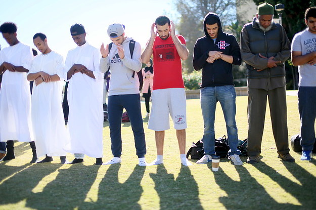 Muslim students pray before at a rally against Islamophobia at San Diego State University in San Diego, California, November 23, 2015. REUTERS/Sandy Huffaker