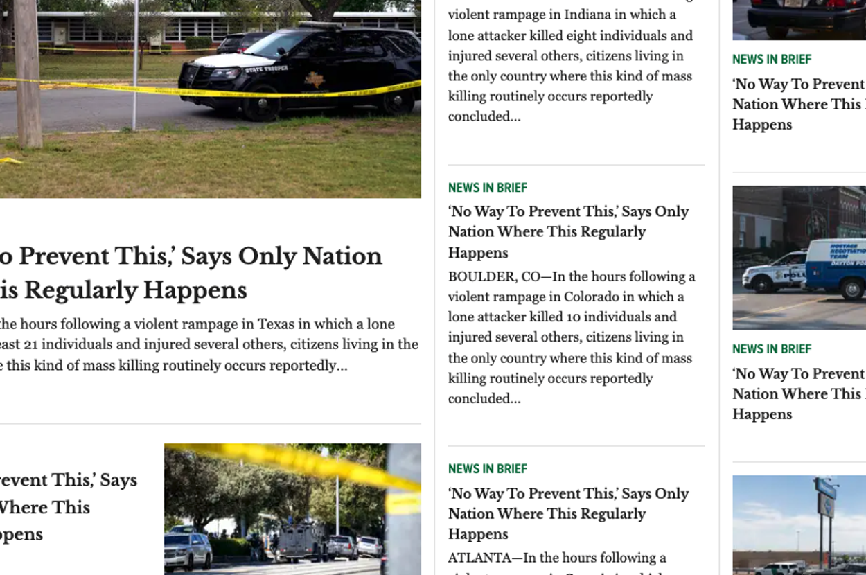 Each time there is a high-profile mass shooting, the satirical website publishes a variation of the exact same story.