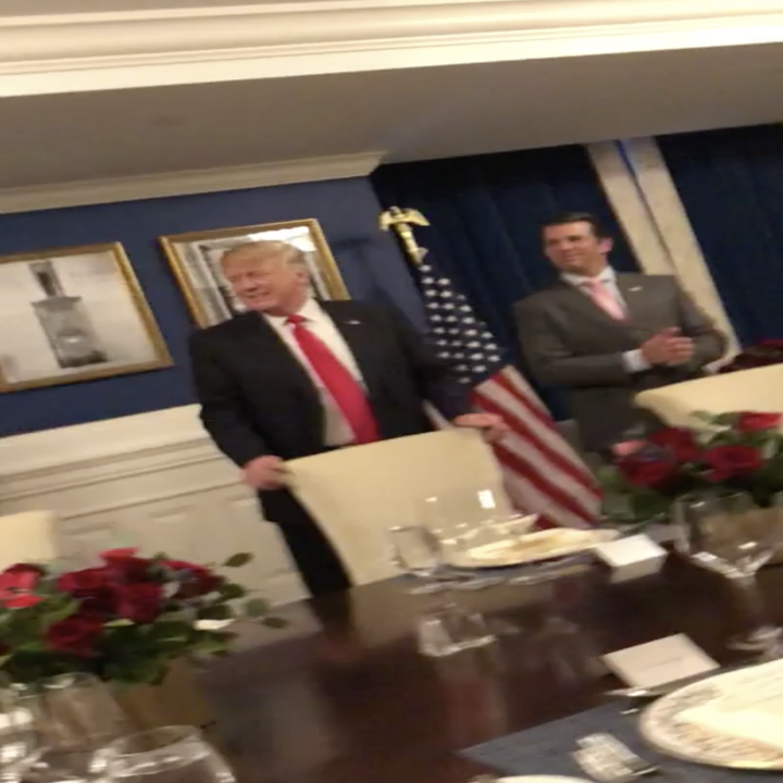 The video also shows a place setting with “Mr. President” written on it. A name tag at the spot next to it says “Mr. Donald Trump Jr.” Later, Trump Jr. stands near his place setting, and his father joins him at the table to applause from the guests.