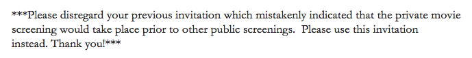The tip was true. An invite did go out promising an early screening and charging $250 a ticket for individuals to attend ($750 per ticket for PACs). But after we asked about it, the invitation changed and a new one went out. Here it is: