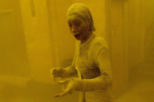 A woman came in completely covered in gray dust. You could tell she was nicely dressed for work and for a second she stood in the lobby. I took one shot of her before the police officer started to direct people up a set of stairs, thinking it would be safer off the ground level.
