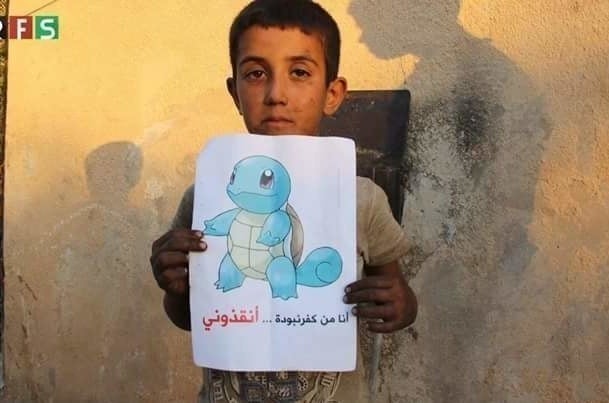 Syrian children holding Pokemon photos in hopes the world will find them and save them